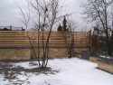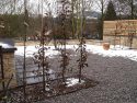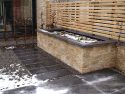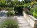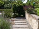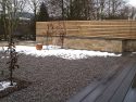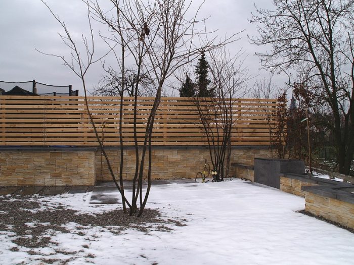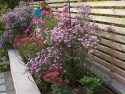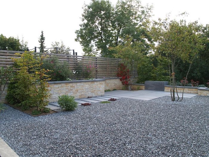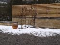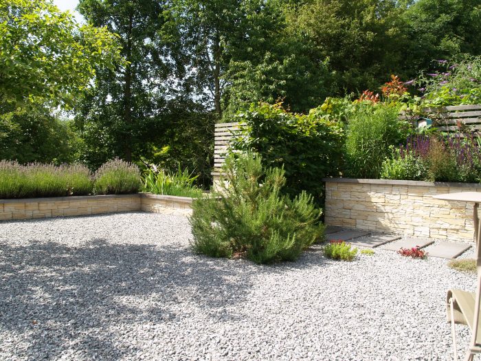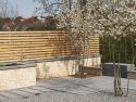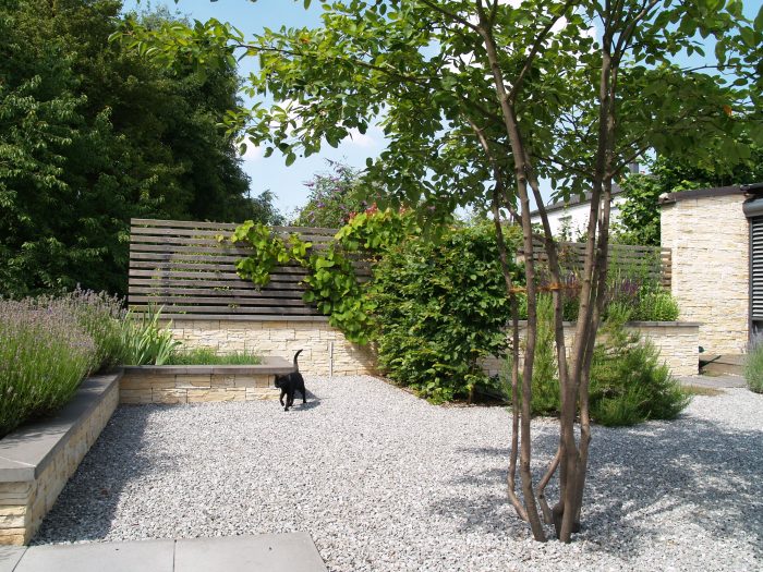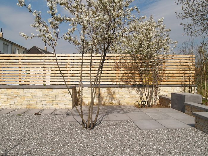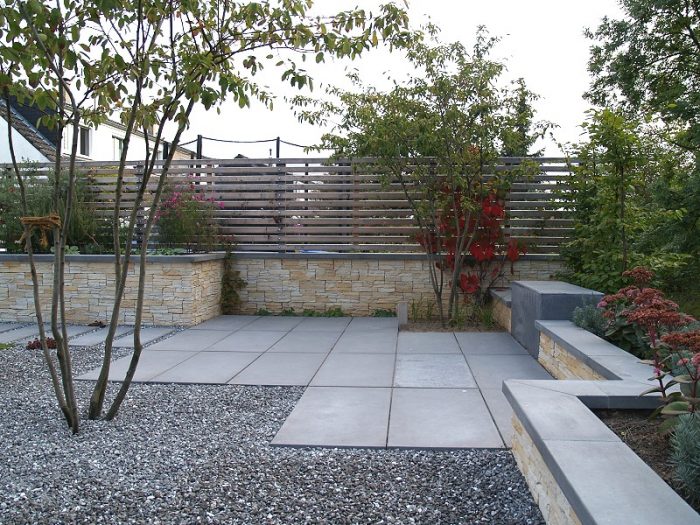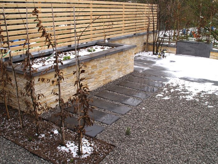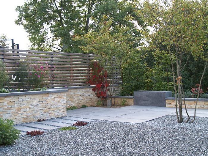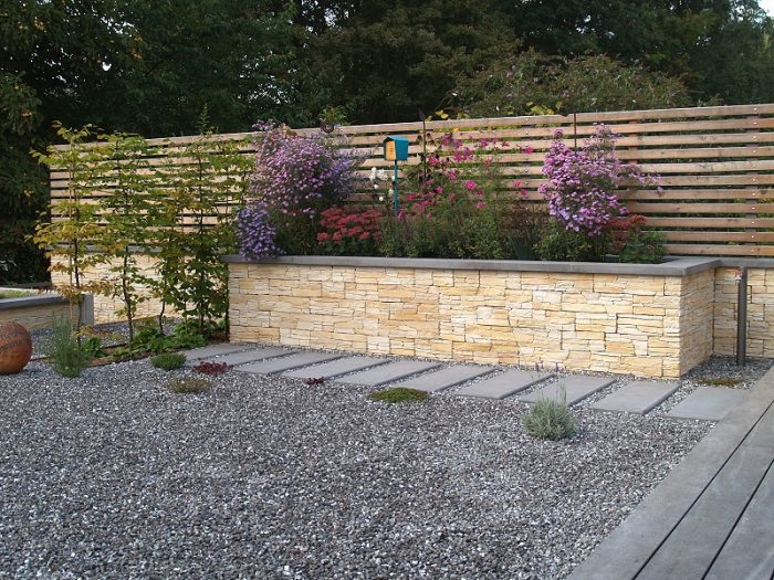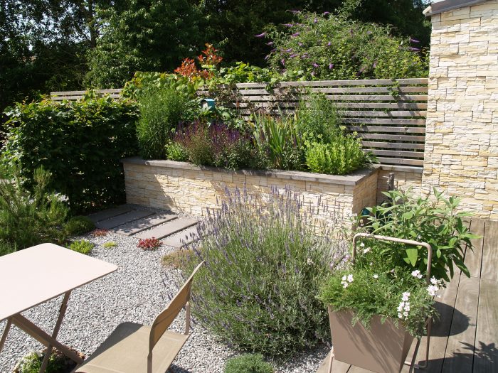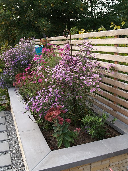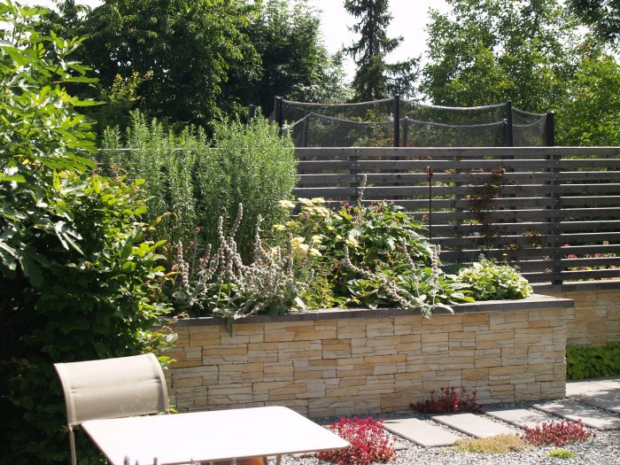 Die Kanten zu den seitlichen Nachbarn wurden durch eine Kombination von Mäuerchen und darauf gesetztem Lattenzaun gefasst. Die Gartenmäuerchen greifen das Material des Wintergartens auf und verbinden dadurch Haus und Garten. Die Hochbeete entwickeln sich aus den Mäuerchen heraus. Zudem bewirkt die vertikale Aufteilung des Sichtschutzes in Mäuerchen und Zaun, dass der Sichtschutz visuell weniger hoch erscheint, was gerade in kleinen Gärten vorteilhaft wirkt. Der berankte Lattenzaun bietet einen guten Sichtschutz, ohne zu stark aufzutragen. In diesem Garten ist der seitliche Sichtschutz aus Mäuerchen, Zaun und Hochbeete zugleich tragendes gestalterisches Element.