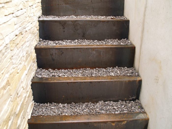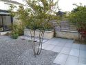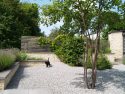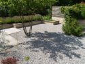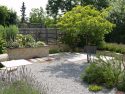 Raumvergrößernd wirkt auch die sparsame Verwendung gestalterischer Elemente: zwei Hochbeete, zwei Felsenbirnen, zwei Heckenriegel, sowie das zentrale Element Sitzplätzchen mit Sitzquader. Die Gliederung des Gartens in Bereiche wird mit diesen nur angedeutet, dennoch ist das Raumgefühl klar und ruhig. Die Materialien spielen dabei keine unwesentliche Rolle. Der eingefärbte Beton korrespondiert sehr gut mit der Mauerverblendung, dem Splitt und dem Holz. Die Anmutung ist unaufdringlich modern.